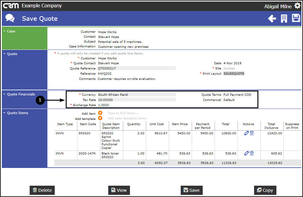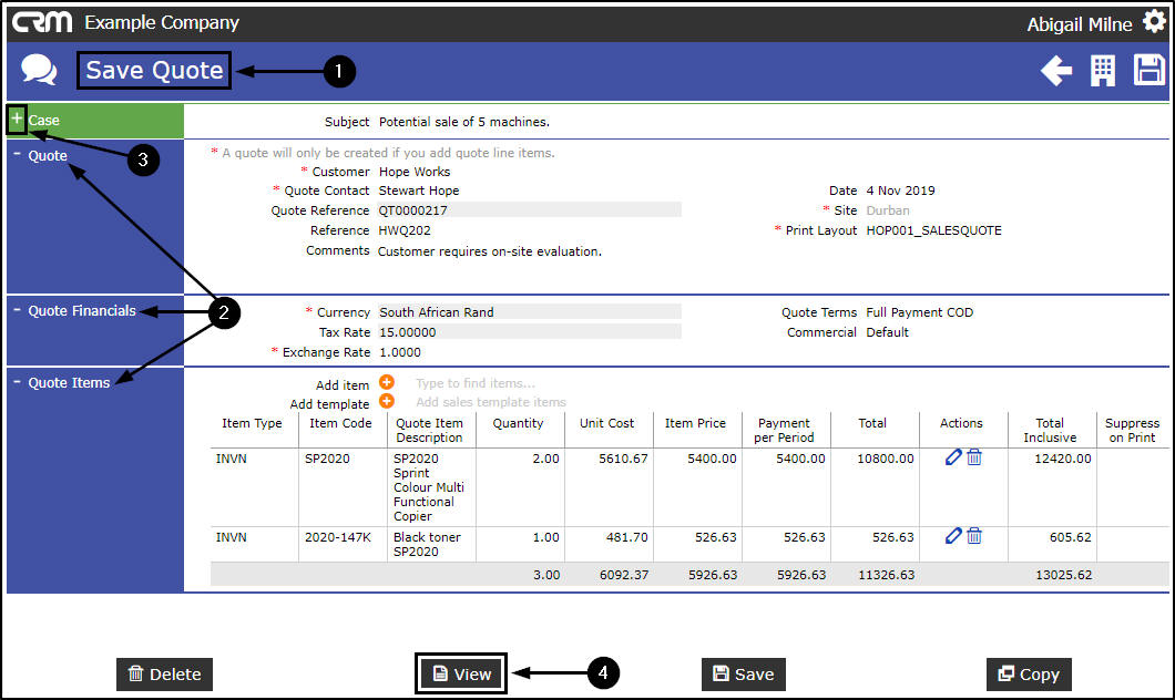 Clicking on the Edit icon takes you to the Save Quote screen, where you can; View, Edit, Delete or Copy the Quote.