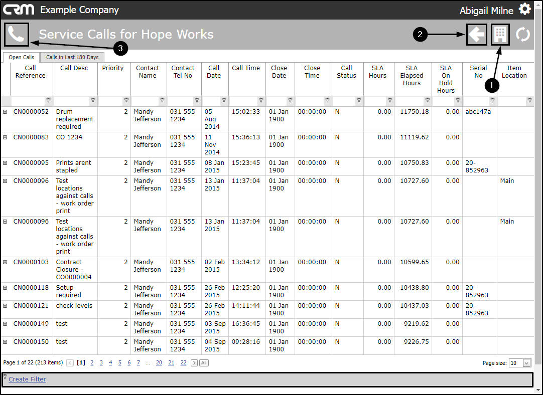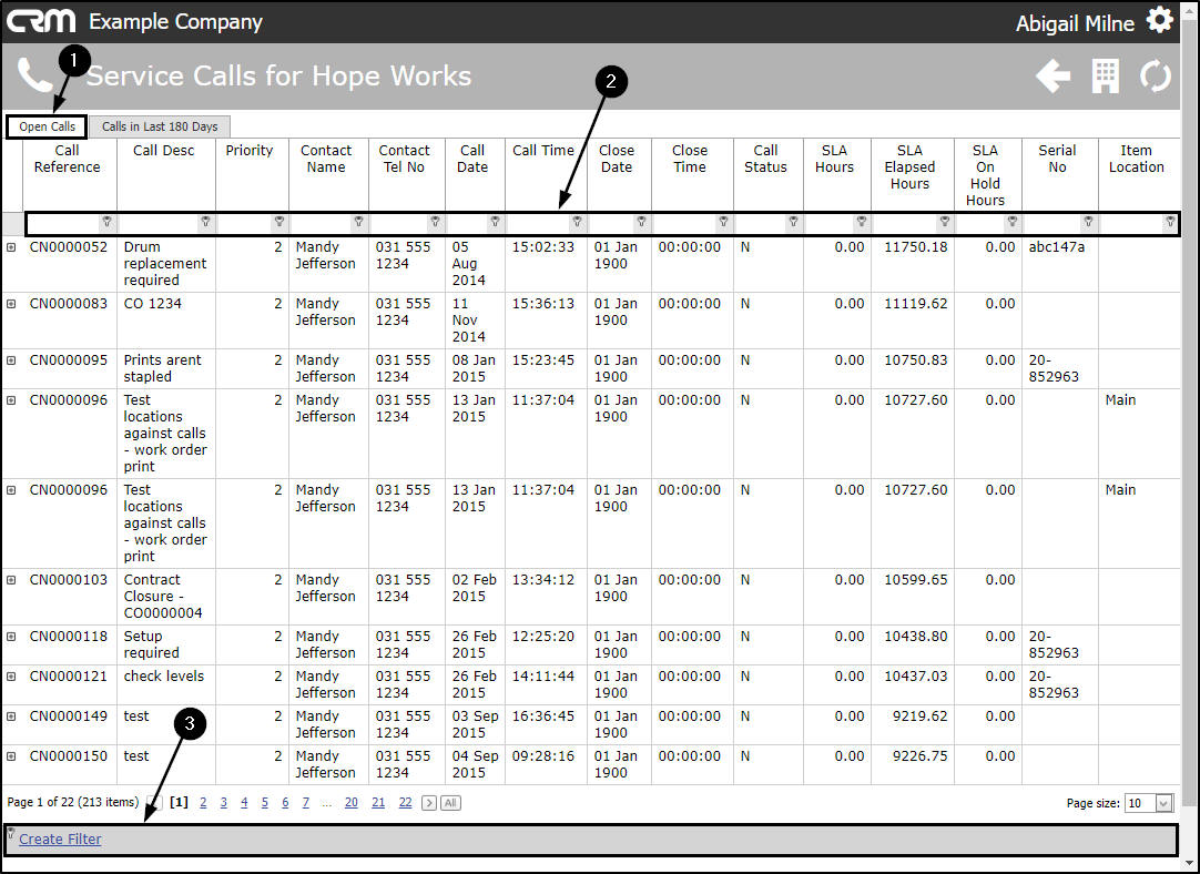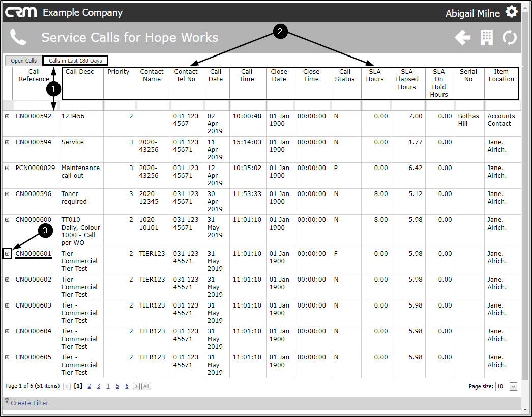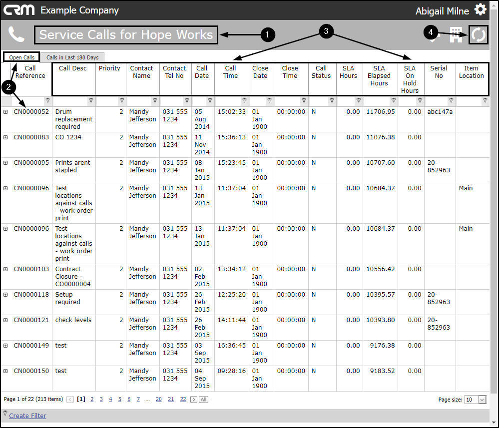 - The Open Calls tab will be at the fore which lists by Call Reference No.all current/open calls linked to this customer.