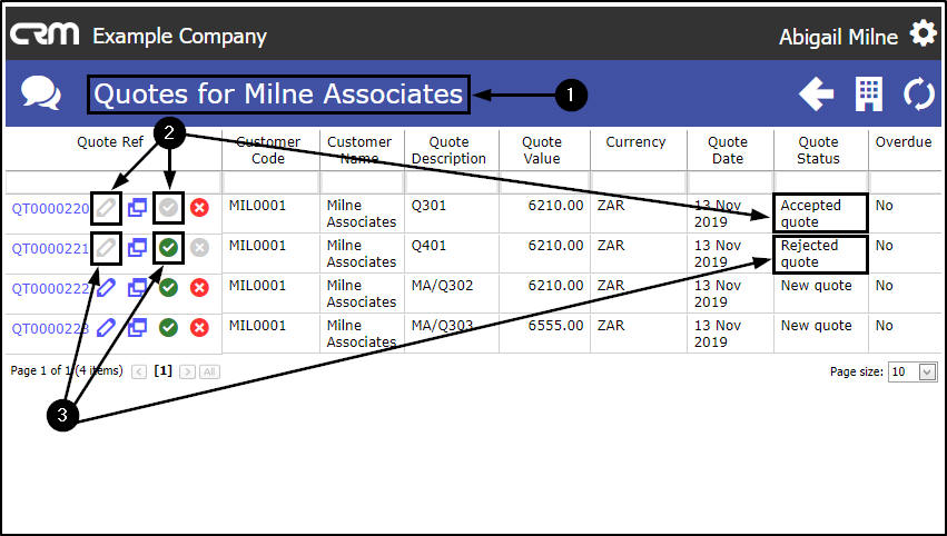 - If, on receipt of your email, your customer selected to Reject the Quote, then the Edit icon and the Mark as Rejected icon will now be Inactive (greyed out) and the Quote Status will have changed to Rejected Quote.