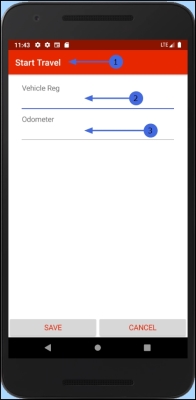 - You will note that the Vehicle Reg number field and the Odometer field will be auto populated with the details entered in the Start Travel screen. This will ensure that you do not enter a different vehicle number by mistake and will remind you of the start travel reading, so that you are sure to enter a higher end travel reading.