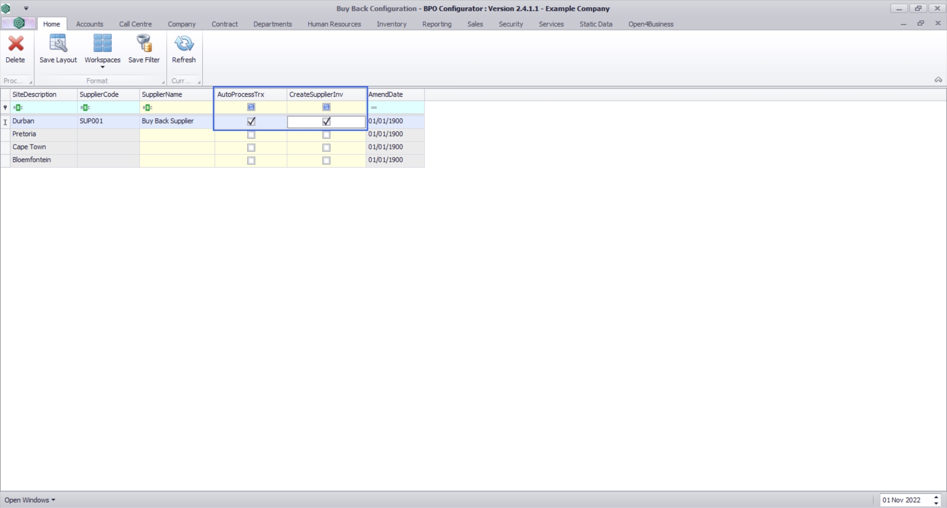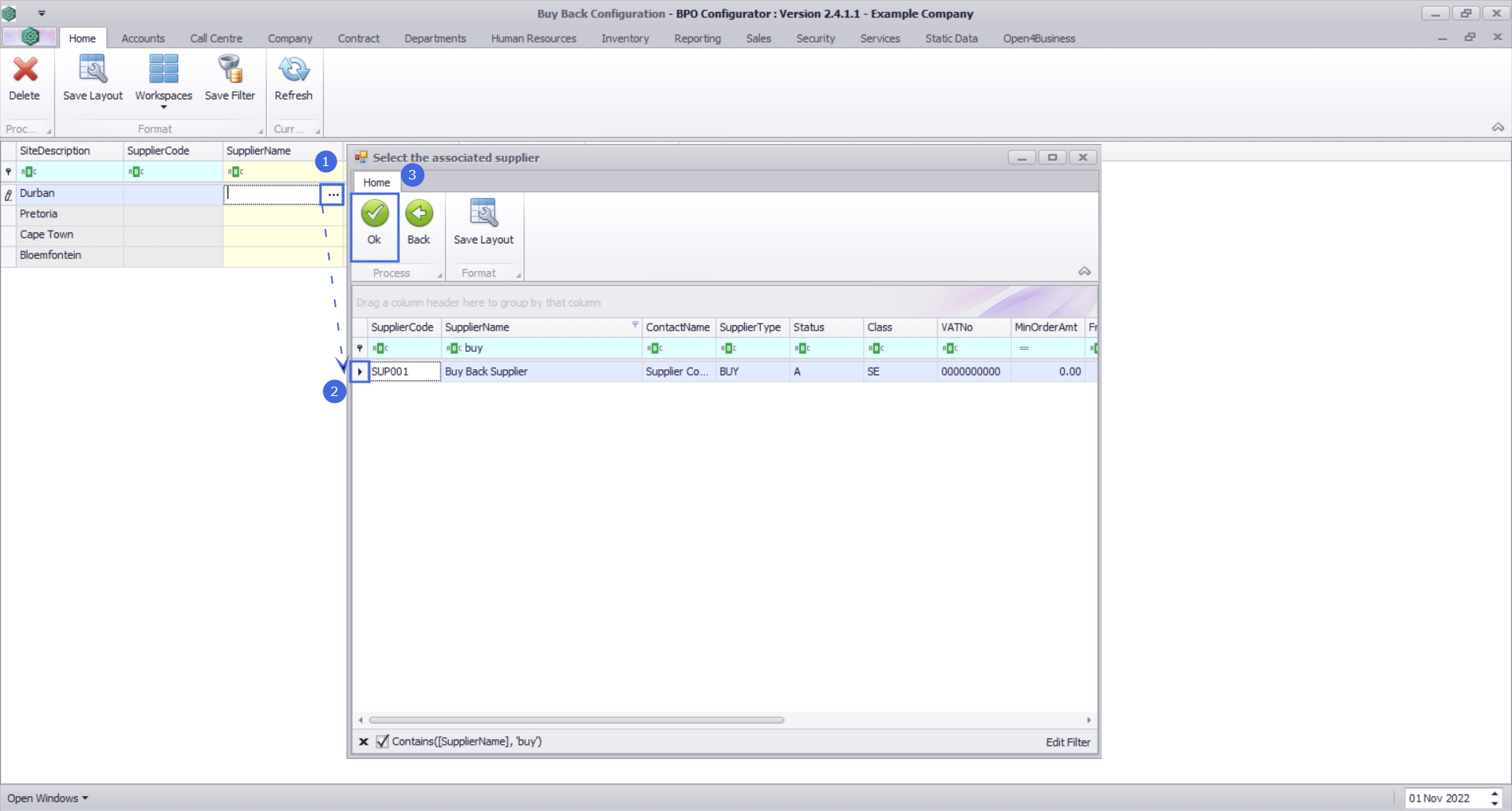 In the Buy Back Configuration, you will select the relevant Buy Back supplier per site, and whether the buy back should be auto processed or not.