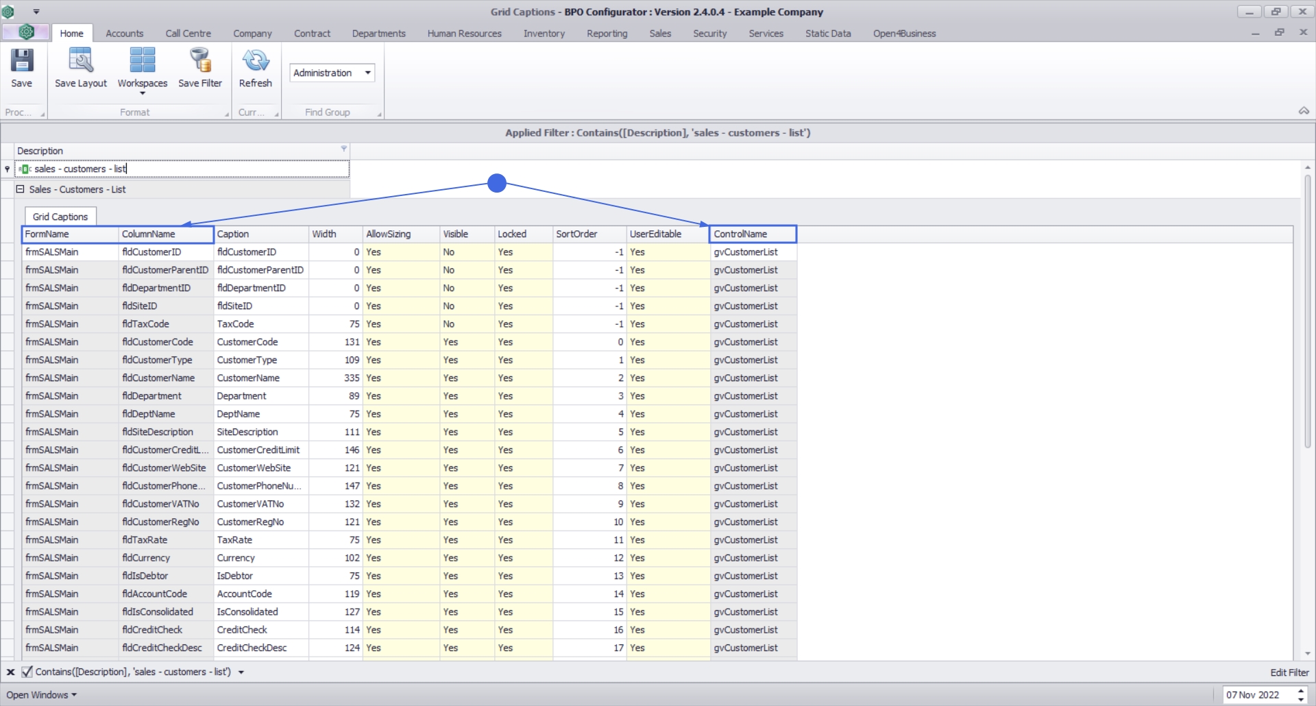 • Click on the (+) to expand the list of captions for the relevant screen. In this example, we are looking at the grid caption list for the Customer Listing screen.