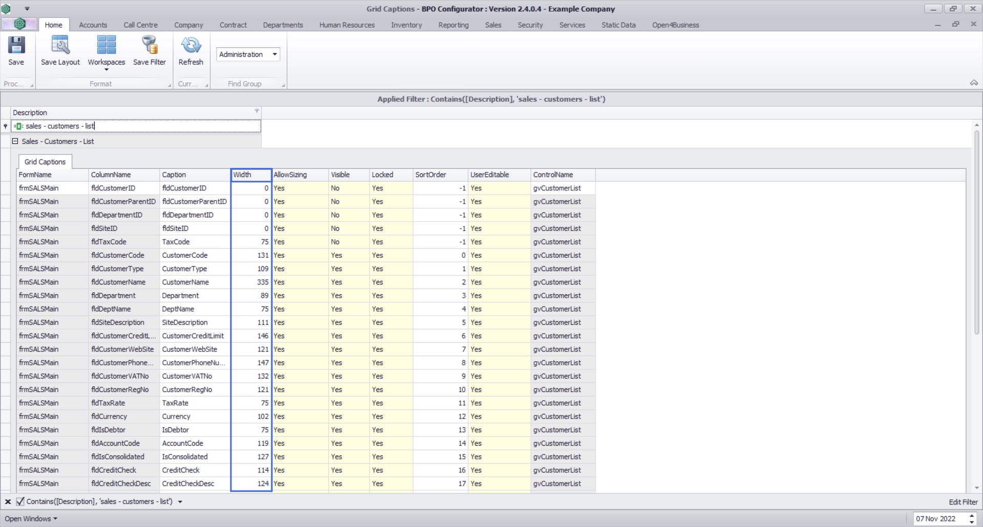 The Width column determines the default width of the column in the relevant screen. 0indicates that the column is not visible. This column can be added back via column chooser, unless Visible = No.