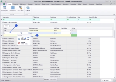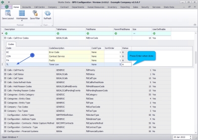 - An available row for adding the new Call Error Code will display in the Codes data grid.