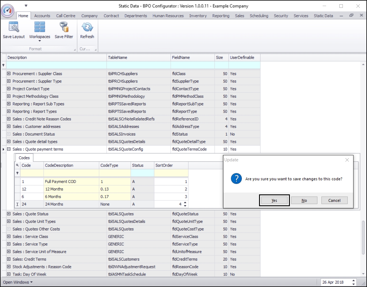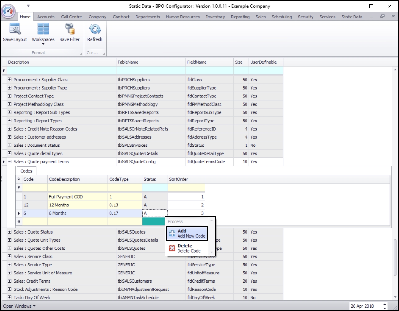 • The new sales quote payment code will be saved and a new row will be added to the Codes data grid.