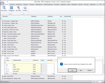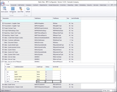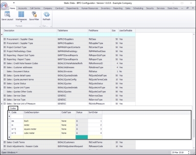 - The new sales: service unit of measure code will be saved and a new row will be added to the the Codes data grid.
