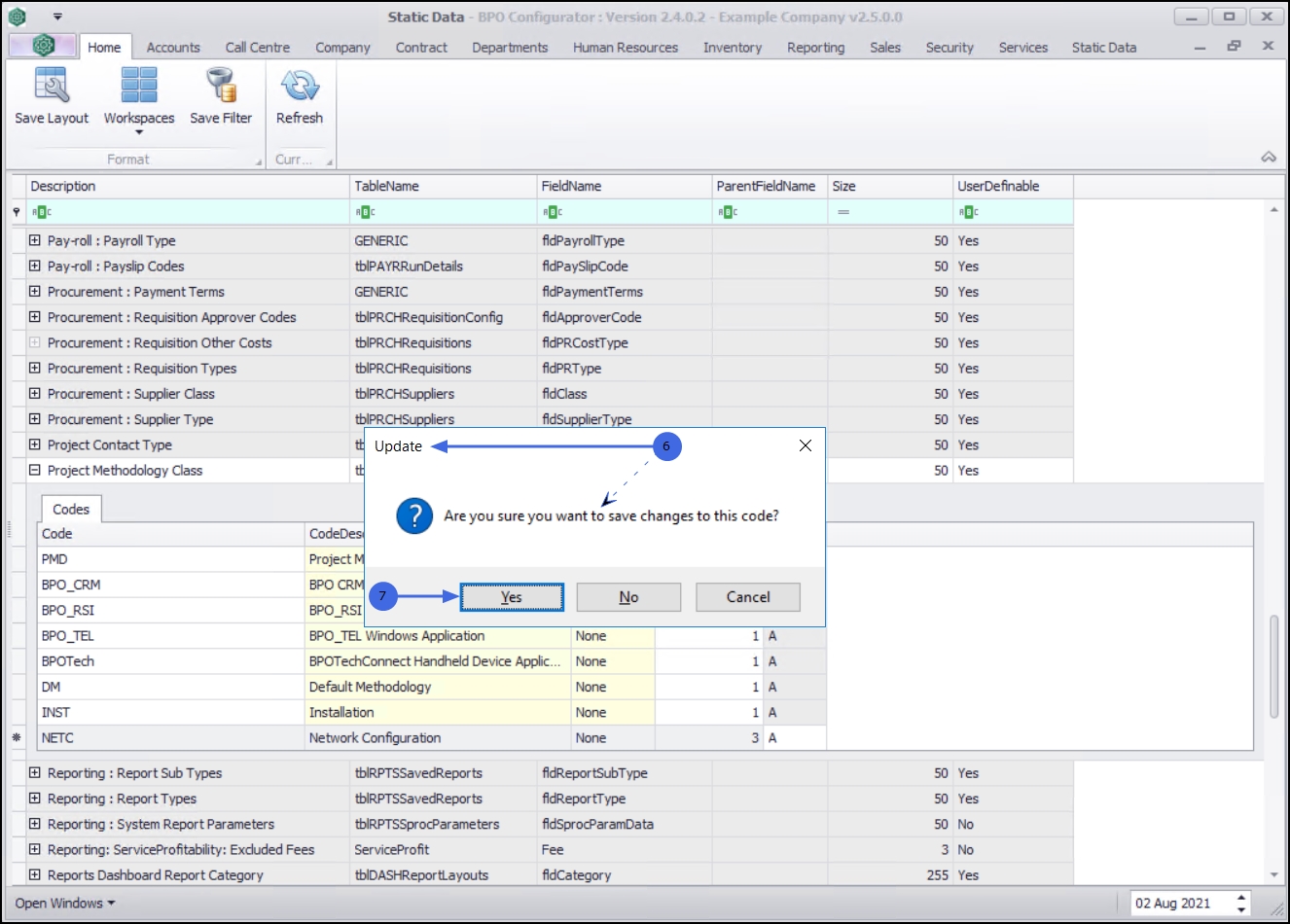 - The new project methodology class code is saved and a new row will be added to the Codes data grid.