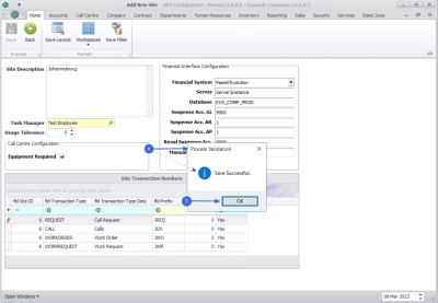 1. When you have finished adding the site description, call centre configuration and financial configuration details, click on Save.