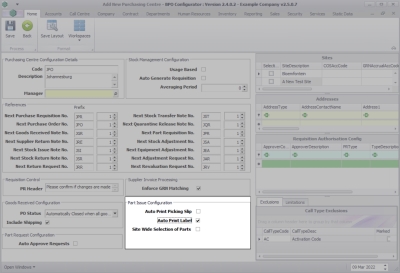 - Site Wide Selection of Parts: Click to select the check box if you wish a site wide selection of parts to be available for a part issue.