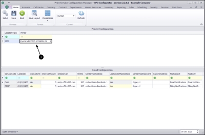 The Service Manager installed on the server, must be configured to include the default Printer and Mail settings for Contract Billing or Billing Reprint and to connect to the BPO database.