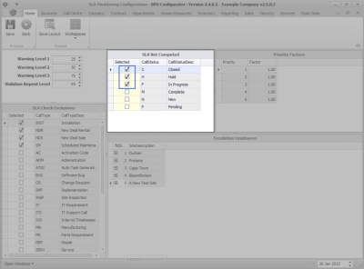 - The example has Installation, New Deal Rental, New Deal Sale and Scheduled Maintenance selected to be omitted from the SLA monitor warning emails.