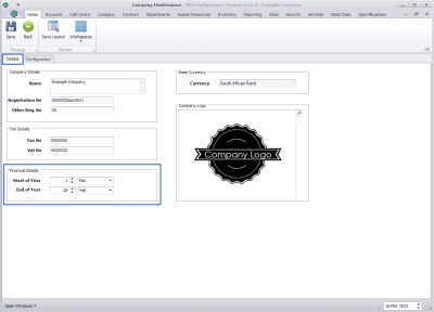 - Date: Either type in or use the arrow indicators to select the start date of the company financial year.