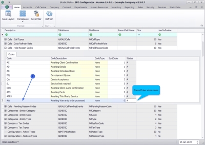 - The new call hold reason code will be saved and a new row will be added to the Codes data grid.