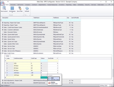- The new sales credit terms code will be saved and a new row will be added to the Codes data grid.