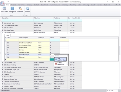 - The new CRM: Contact Role code will be saved and a new row will be added to the Codes data grid.