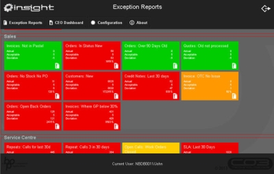 - The Exception Reports will quickly show you areas of concern - where items are out of acceptable exception target. Green dashboard items are within acceptable range. As the items move out of acceptable range, the colour will move from Yellow, to Orange, to Red.