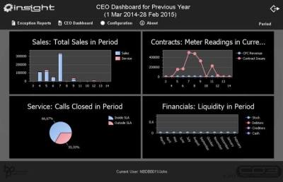 - The CEO Dashboard has four charts to quickly give you an overview of Total Sales, Financial Liquidity, etc.
