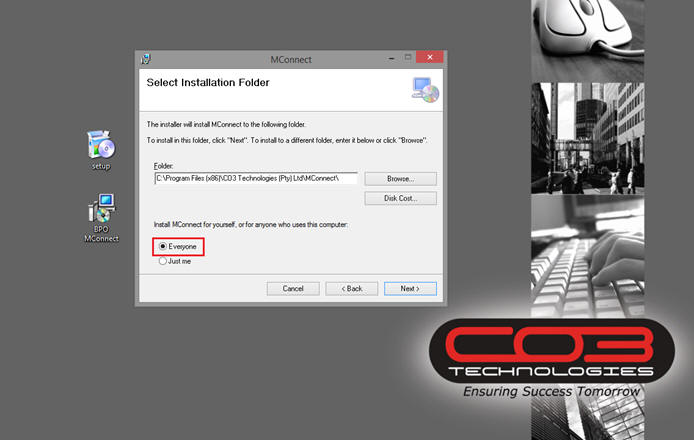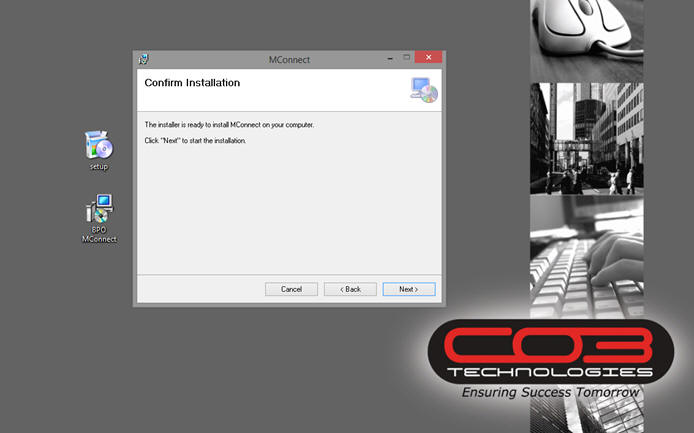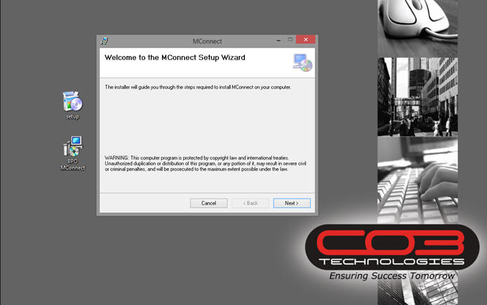 - The default location for installation is: C:\Program Files (x86)\CO3 Technologies (Pty) Ltd\MConnect. It is recommended that you keep this default location. Keeping a standard will make upgrades easier.