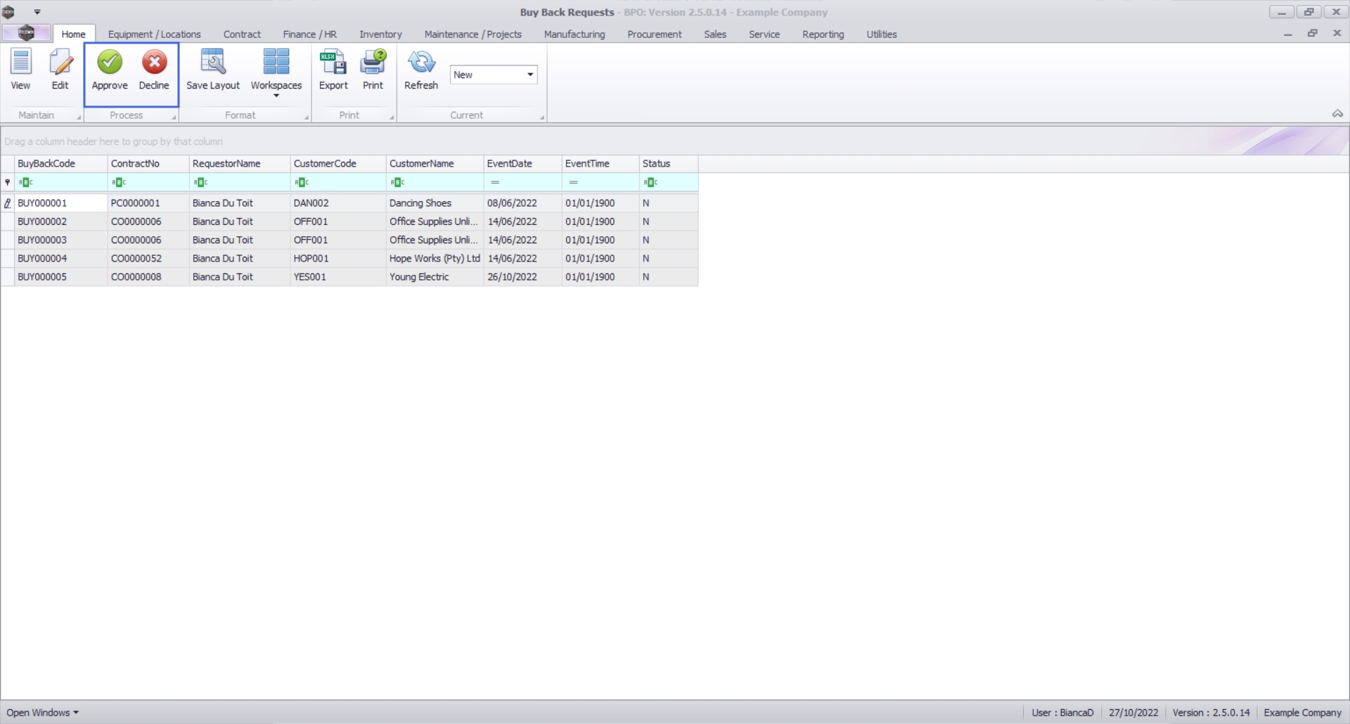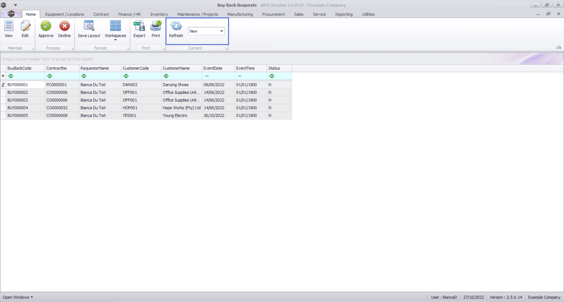 Upon opening, this screen will default to the New status, listing all Buy Back Requests that still require processing.