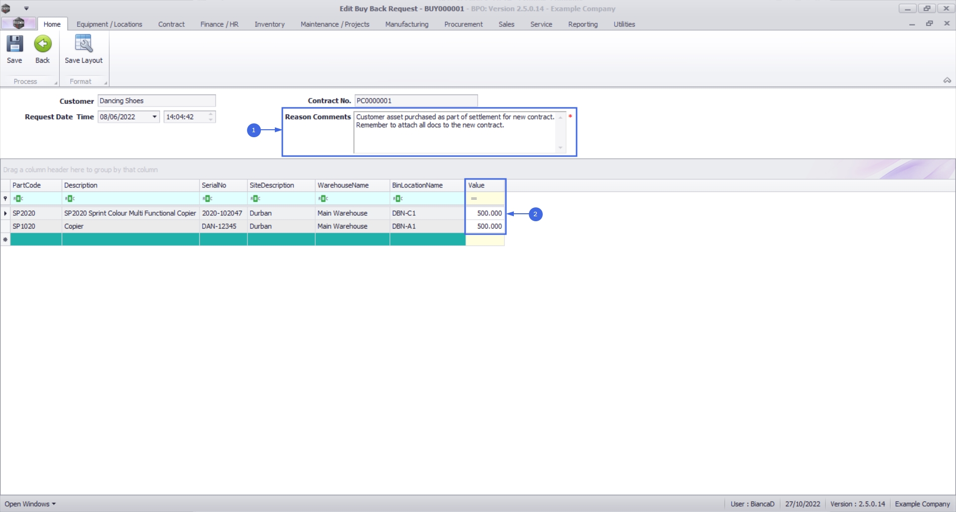 For expired contracts that remain active, you have the ability to buy back serial numbers that have been selected, if the selected items are customer assets.