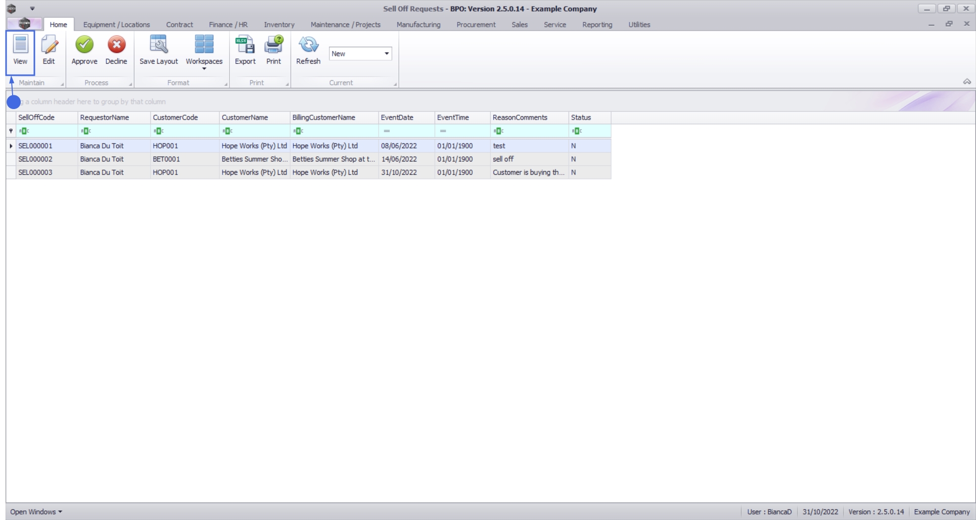 - Customer Name, Billing Customer, Sell Off Request Date and Time, Contract Number, and the item(s) to be sold with the selling value.