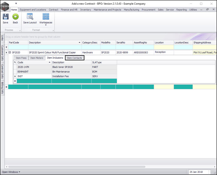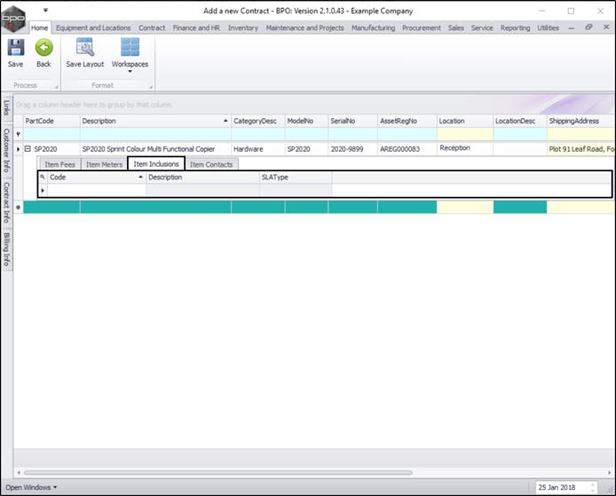 - The Item Inclusions frame lists all Contract Inclusions (items which are included in the contract and not billed separately).