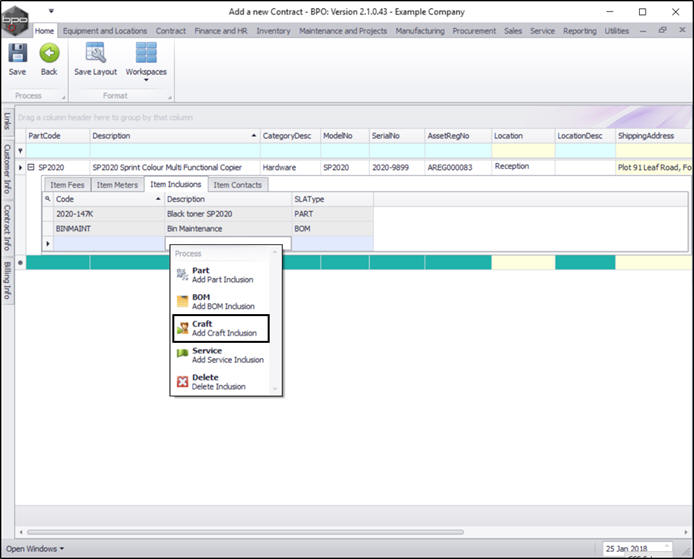 - Click on BOM - Add BOM Inclusion (contract inclusion parts issued to a call that will not be billed).