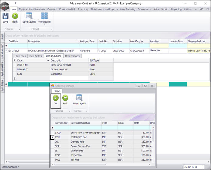 - Click on the row selector in front of the service you wish to add to this contract as an inclusion.