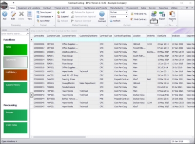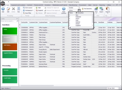 - Upon opening, this screen will default to the Active status, listing all the Active contracts for the selected site.