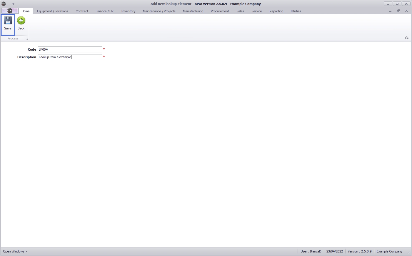- Type in the lookup item Code and Description.