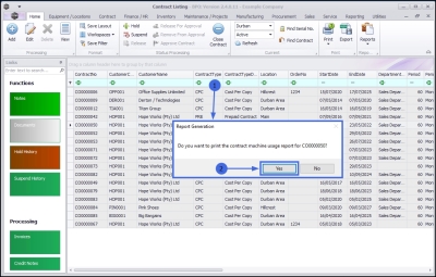 From the Contract Listing screen, you can view and print the Machine Usagereport.