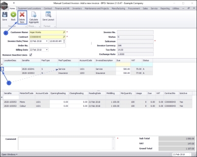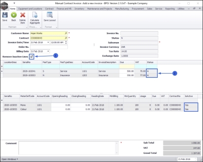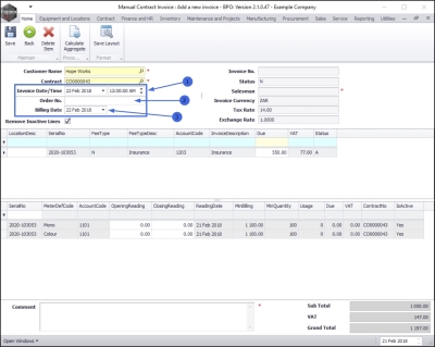 Using a Manual Contract Invoice to bill any one machine on a contract for either fees or meters or both within the current billing period, will prevent a contract invoice from being raised at month end for that contract – for either fees, meters or both.