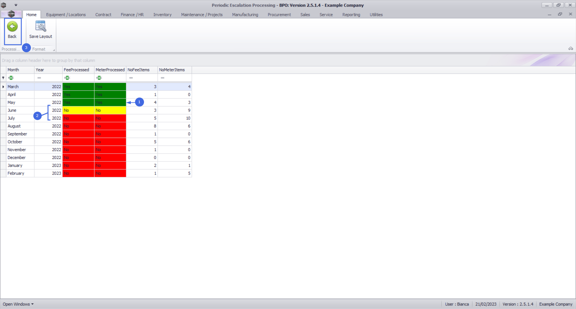 - The No Meter Items column will show you the number of contract item meters that are to be escalated in the relevant billing period.