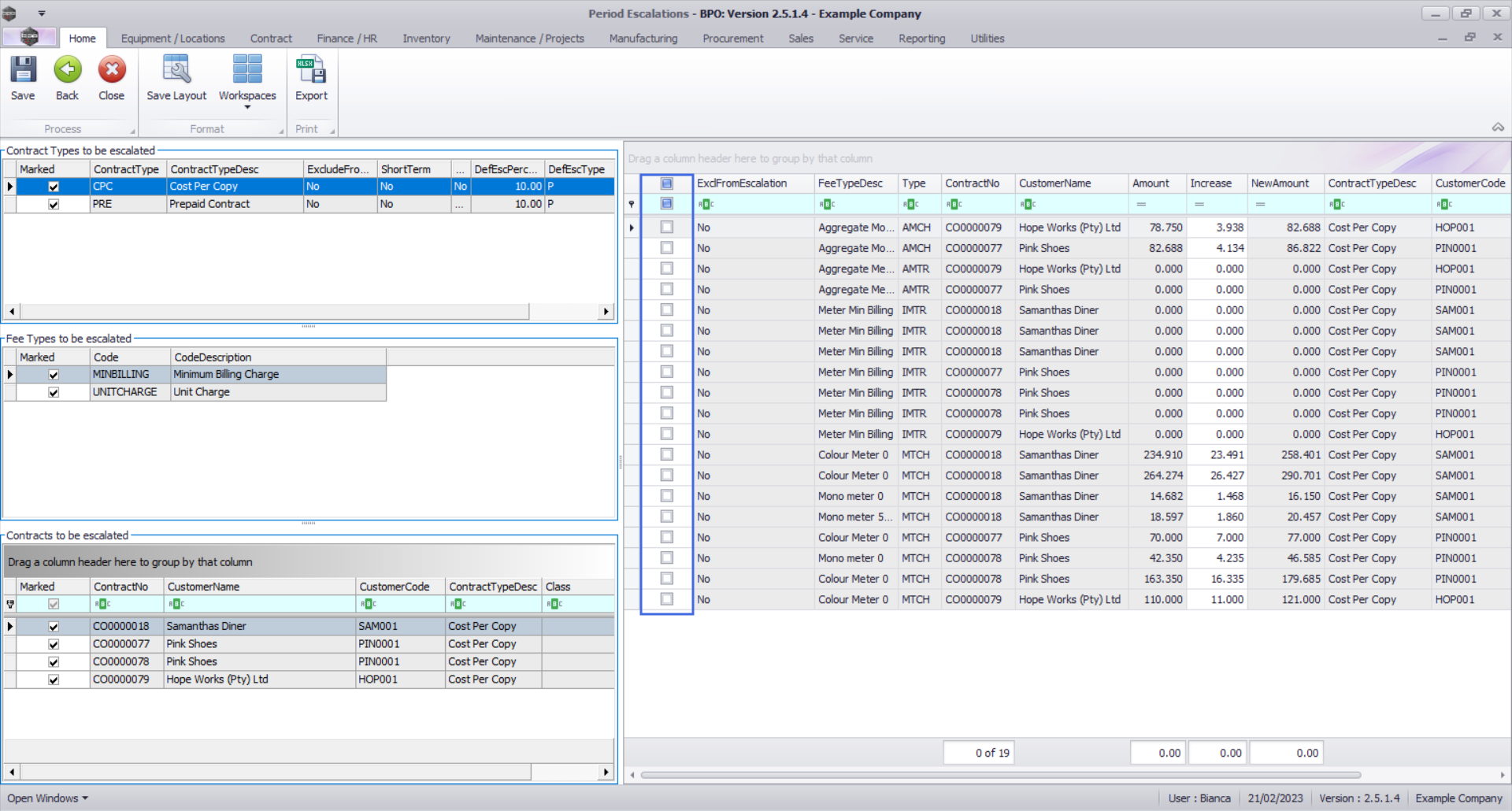 - You can use the Marked check boxes to select the Contract Types, Fee Types, Contracts, Contracts Items that you wish to escalate.
