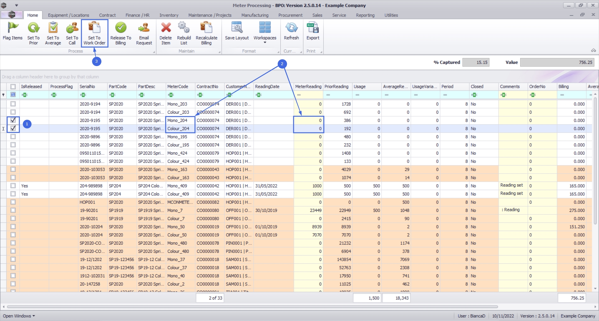 - In this example, the Mono meter reading is now 450 and the Colour meter reading is now 225 which (as shown in the next image) is the same as the last Work Order reading in the current period.