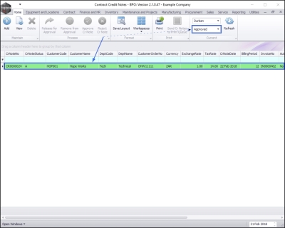 - The selected credit note has been moved to the Contract Credit Notes listing screen where the status is set to Approved.