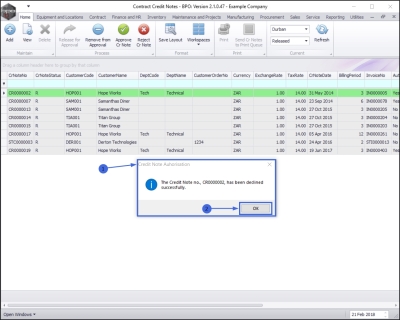 - The selected credit note has been moved to the Contract Credit Notes listing screen where the status is set to Declined.