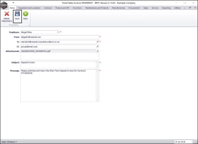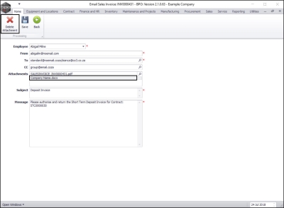 - Email: - can attach documents, add recipients, the system will create a PDF and email the Invoice.