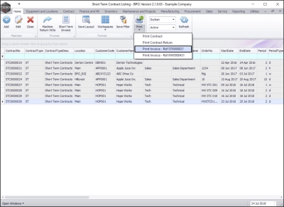 - Select the row of the short term contract where you wish to print the deposit invoice.