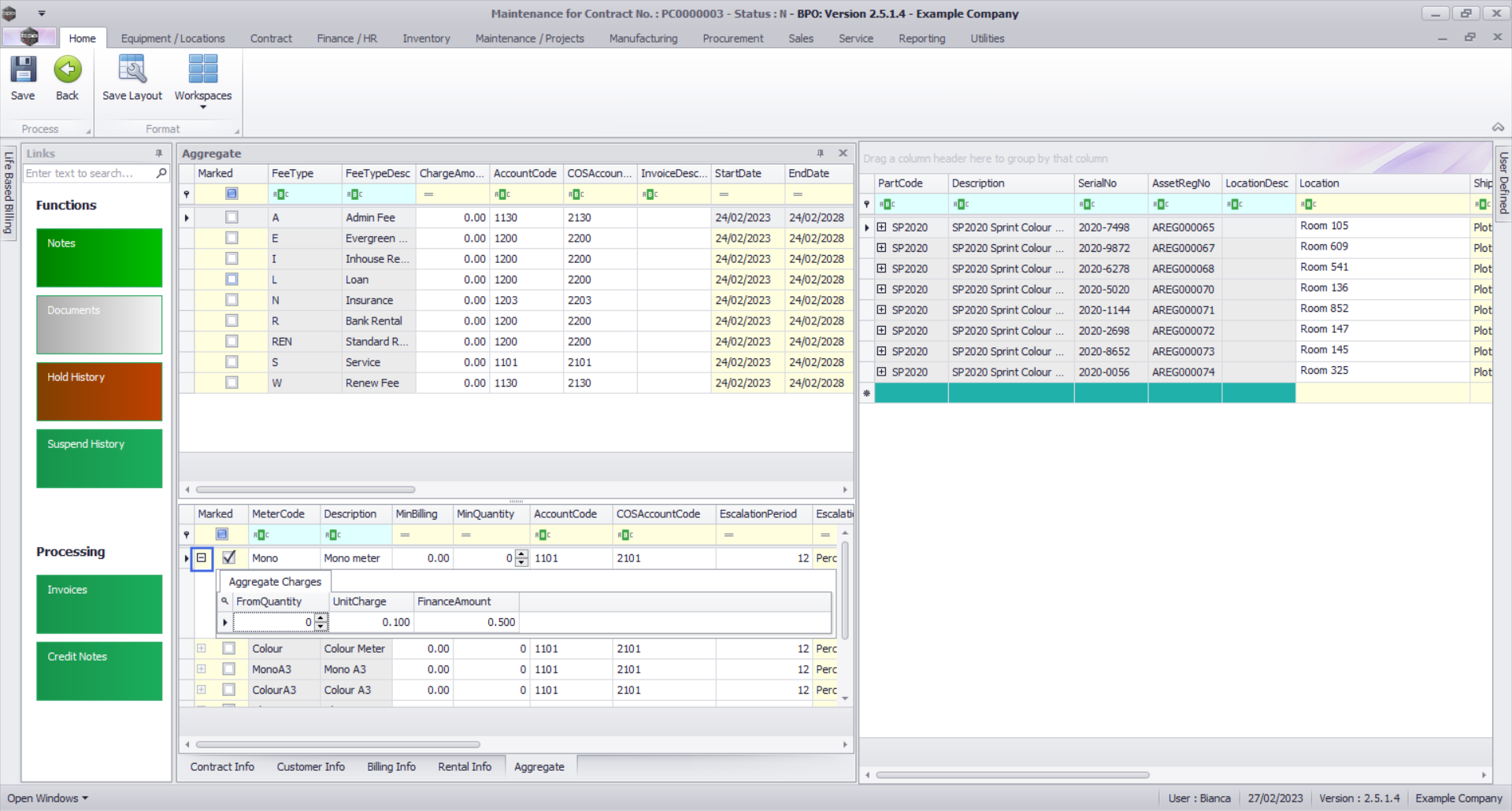 - Meter min (minimum) billing and cost per copy charges are set globally per meter type per contract, where aggregate billing is required.