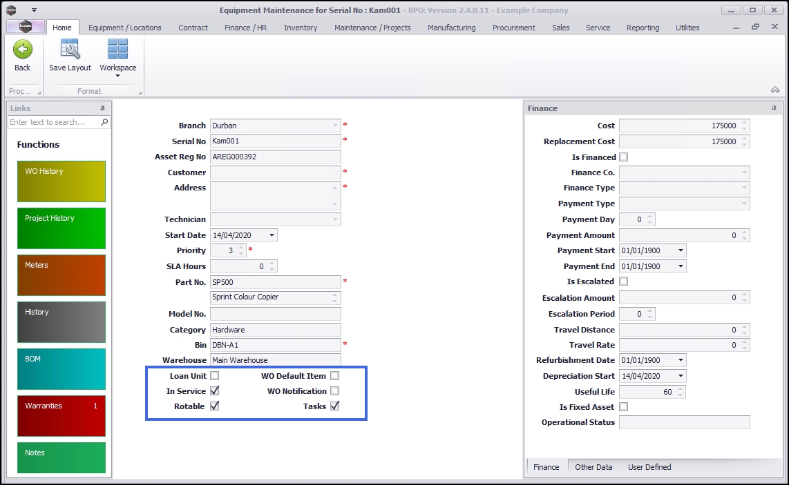 - WO Default Item: If this option is set in the company configuration, one machine per customer needs to be marked as the default (this machine will pull through automatically when a customer is selected on a new call). This does not apply to a serialised stock item the check box can be unchecked.