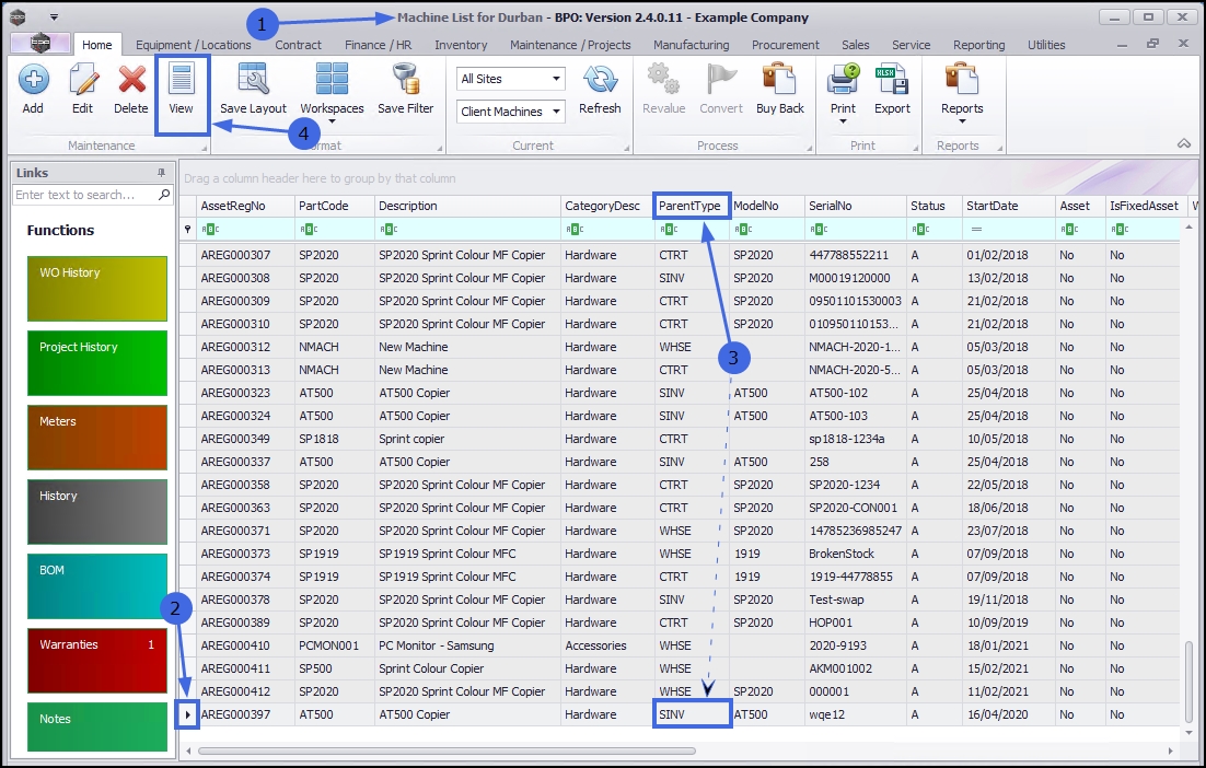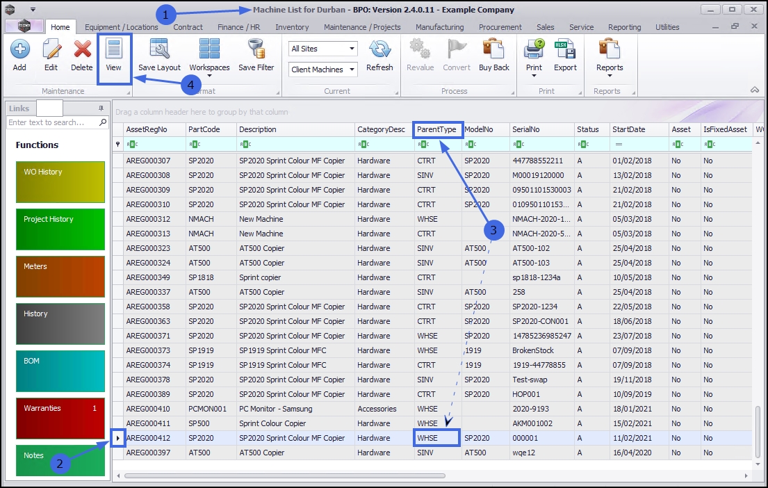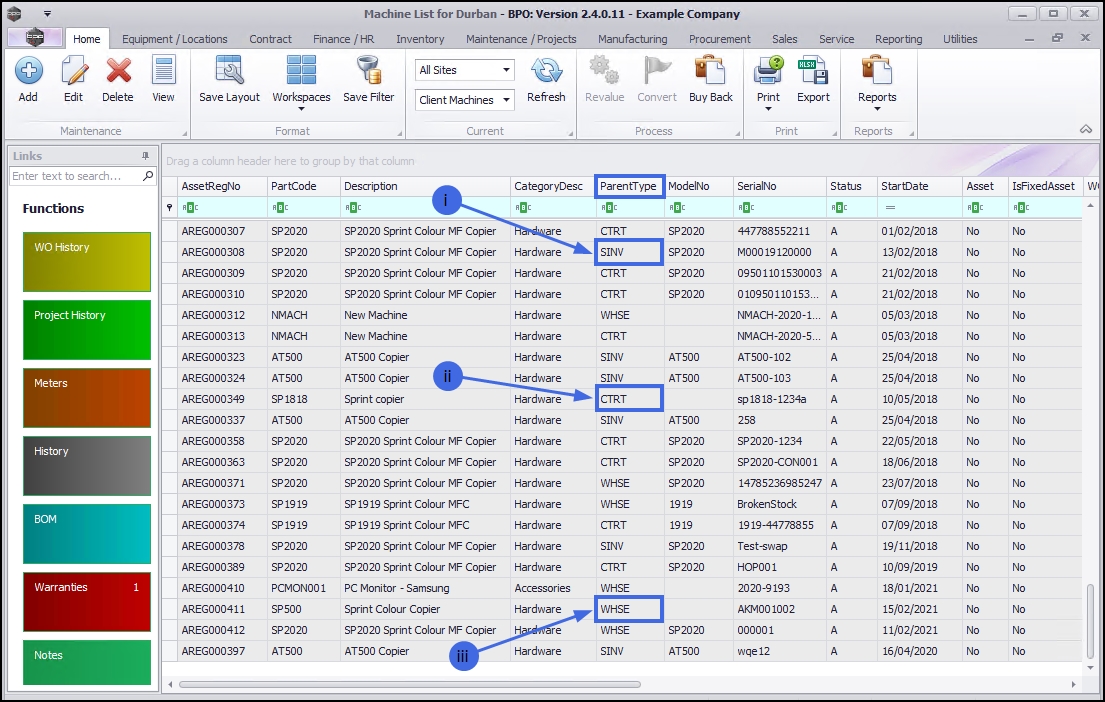 - The next 2 field names will differ depending on the Client Machine Parent Type. In this example, an asset with the Parent Type: WHSE - Warehouse was selected.