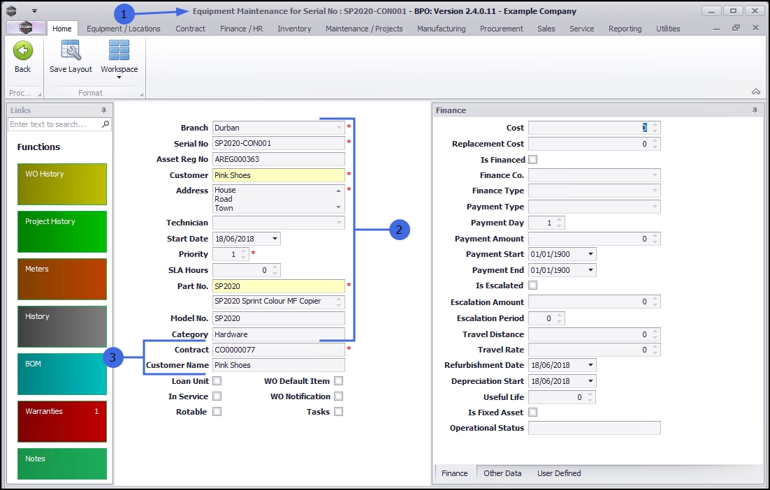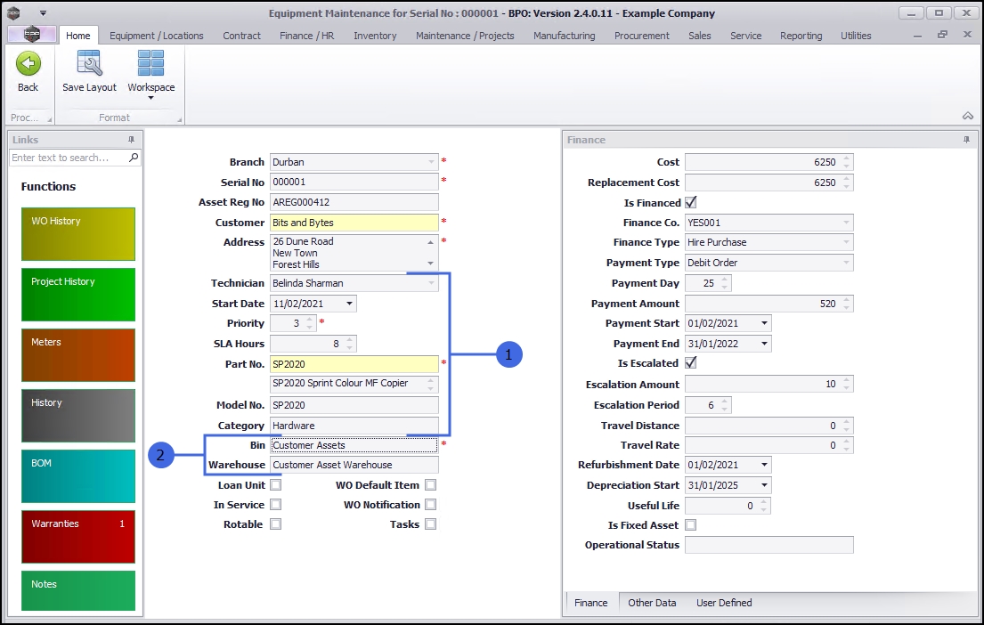 This information will also reflect in the Call Maintain screen where the asset is linked. Although the fields can be viewed from the Call Maintain screen, the actual information can only be edited in the Asset Maintain screen.