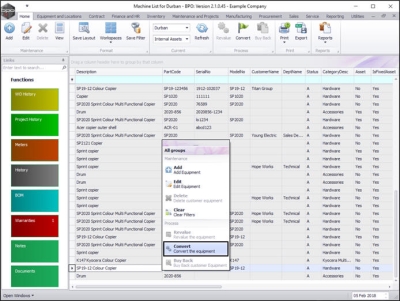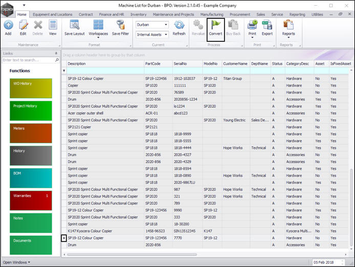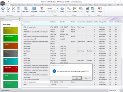 - Select the row of the serialised item that you wish to convert from an internal asset to stock.
