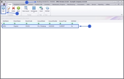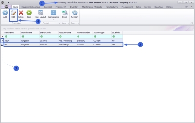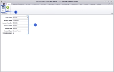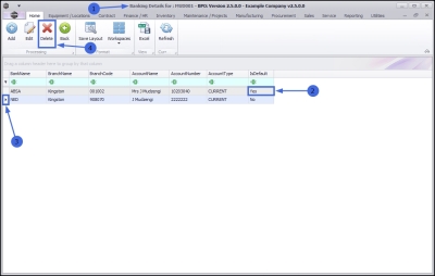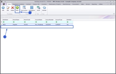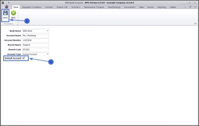 Note on Default Account Settings: Selecting the bank account as default 'Yes', will set any other accounts in the data grid to 'No' as only one Default Account can be set up.