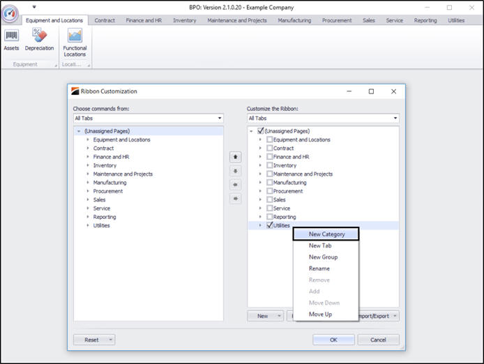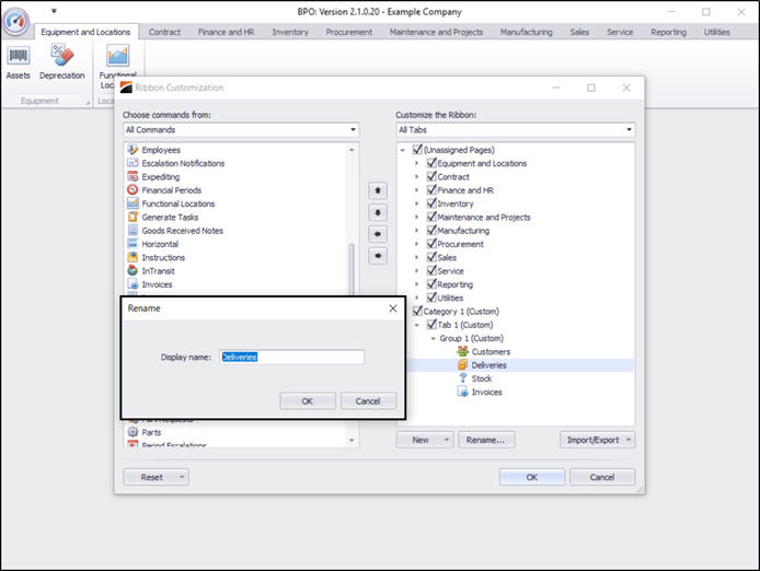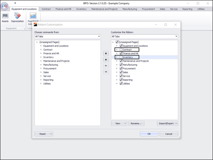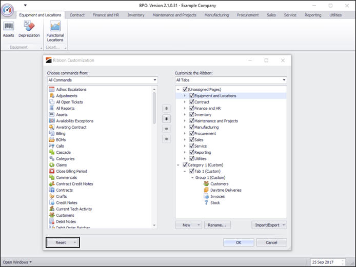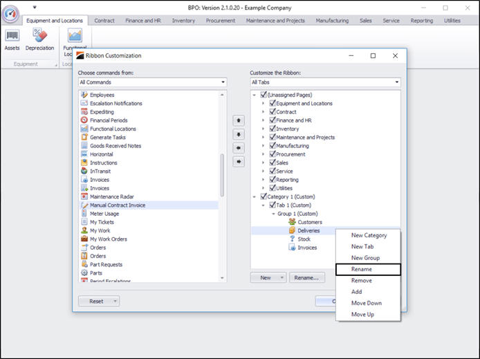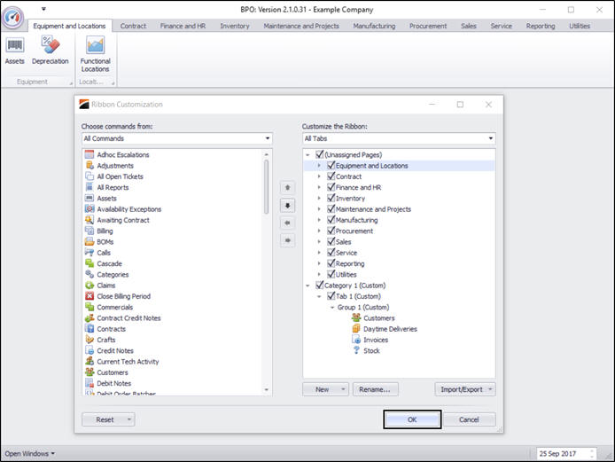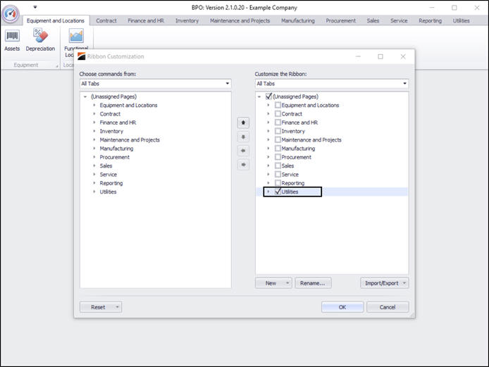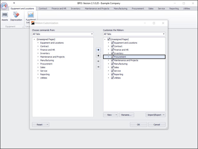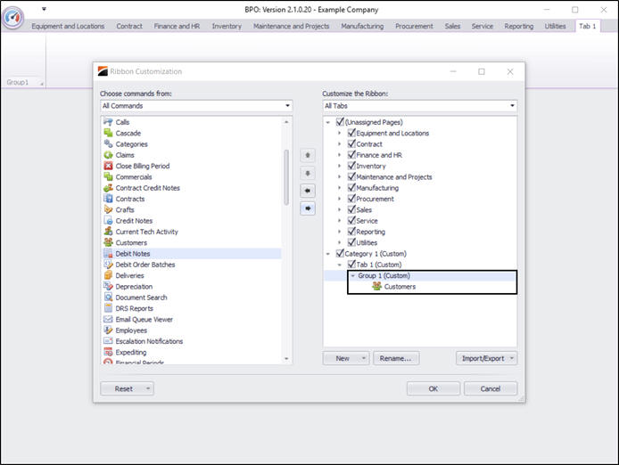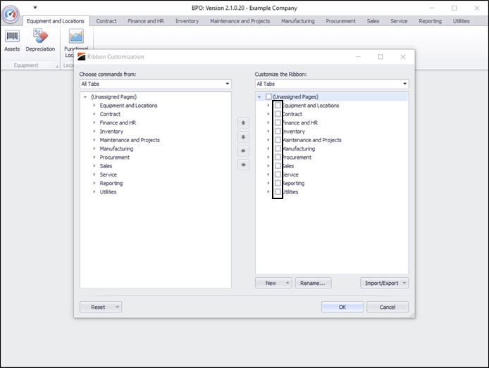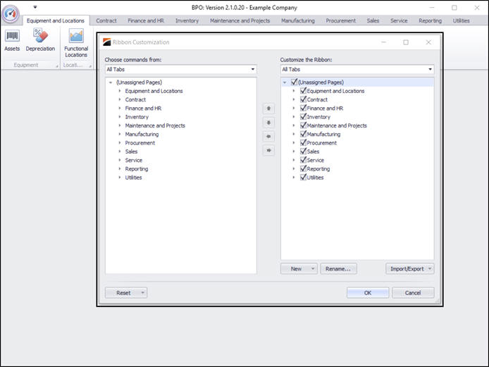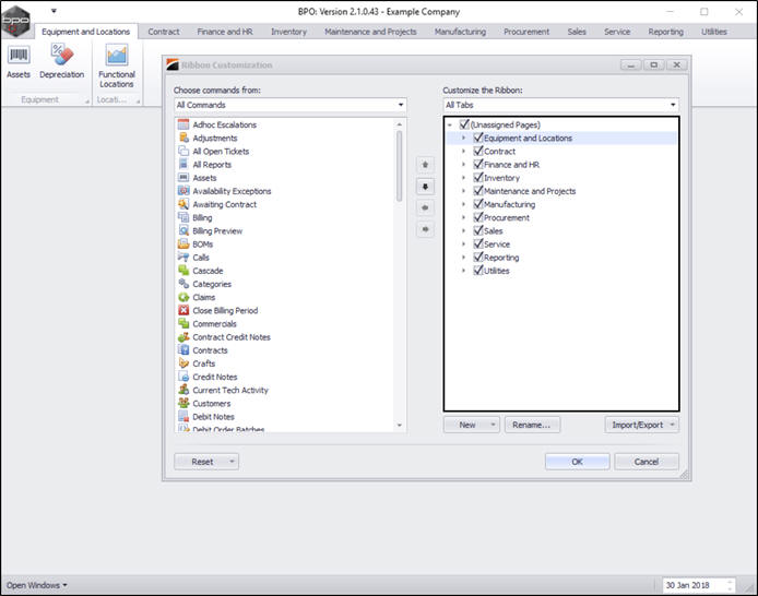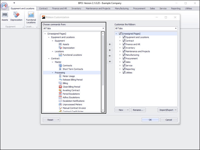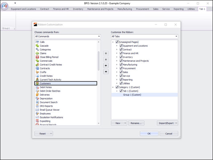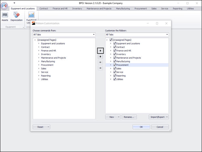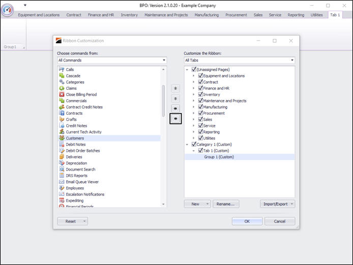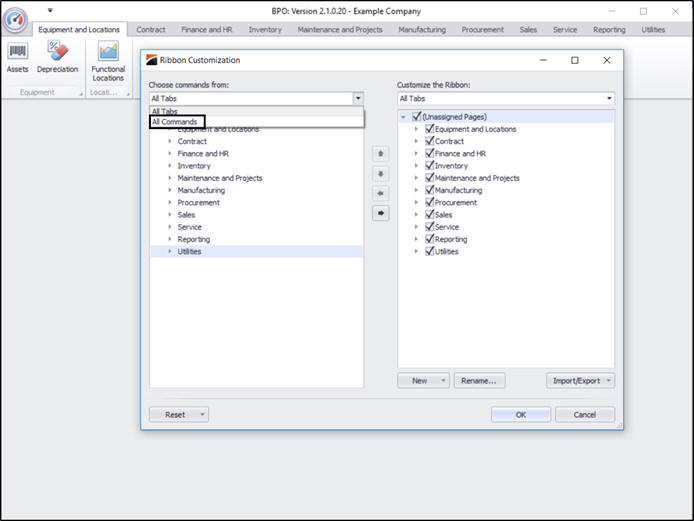 - The left-hand side of this screen is the Choose commands from: menu which contains a list of all the Tabs and Commands available in BPO2.