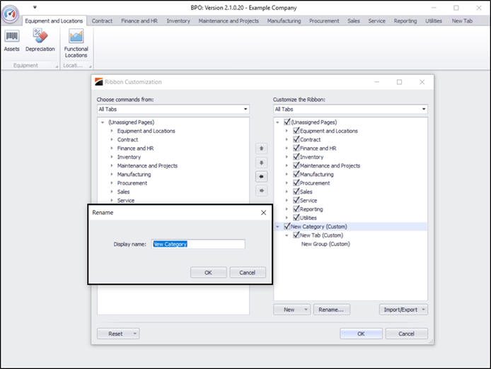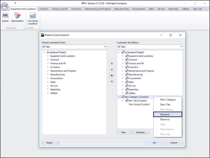 - All Categories and All Tabs can be renamed but New Groups can be renamed and have any Commands added to them.