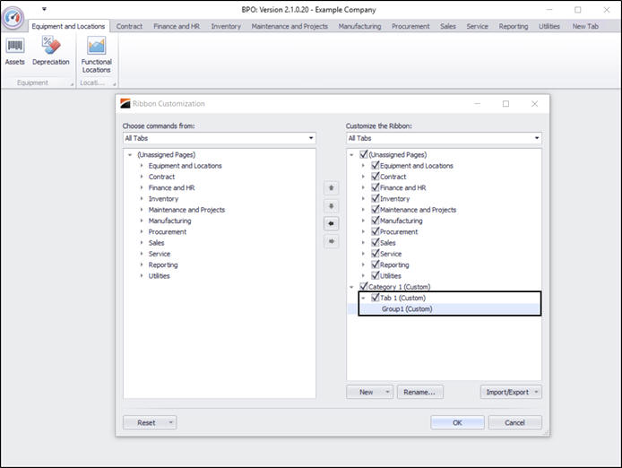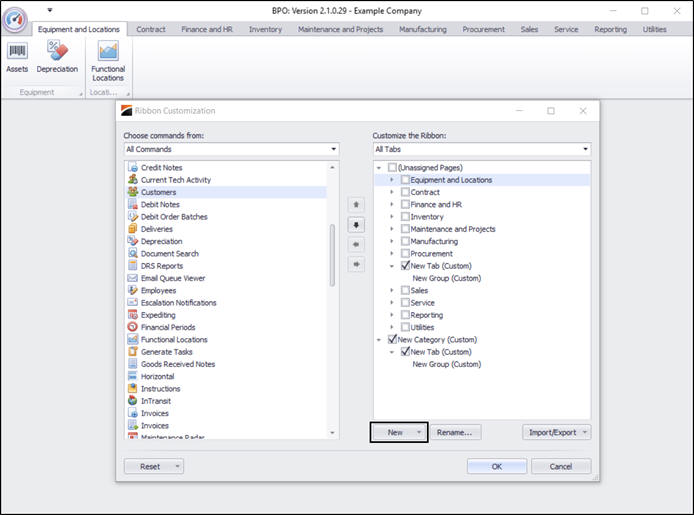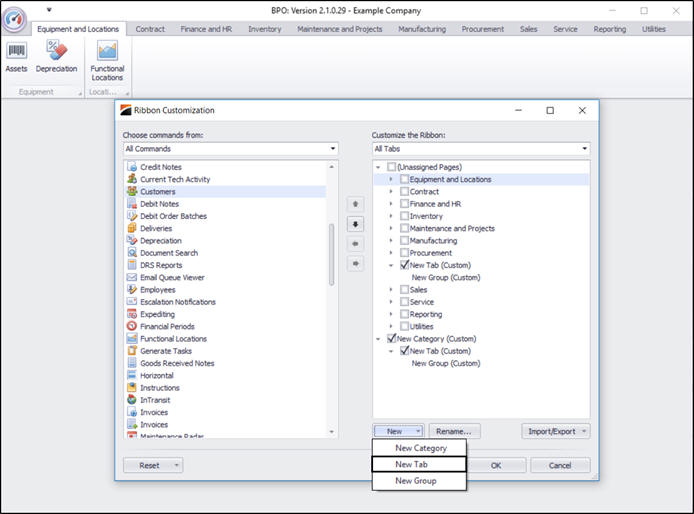 - In this image, the New Tab (and New Group) were added below the Equipment and Locations Tab which was highlighted.