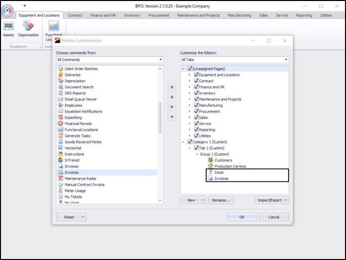 - In this image, the Stock and Invoices commands have also been added to Group 1.