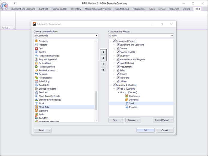 - This list of Commands can be re-ordered (as with Tabs) according to your preference using the arrows in the centre of the screen.